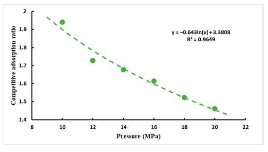 The simulation was carried out under the condition that the initial pressures of CH4 and CO2 were equal and increased synchronously. The total and excess adsorption of CH4 and CO2 at each pressure point are shown in Figure 12. As the total pressure gradually increased from 10 MPa to 20 MPa, the excess sorption of CH4 increased from 0.007 mmol/m2 to 0.013 mmol/m2, the excess sorption of CO2 increased from 0.014 mmol/m2 to 0.019 mmol/m2, and the excess sorption of both CH4 and CO2 increased with the increase in pressure. Figure 13 shows the scatter plot of the pressure versus CO2/CH4 competitive adsorption ratio and its regression curve, from which it can be concluded that the CO2/CH4 competitive adsorption ratio gradually decreases with the increase in pressure.