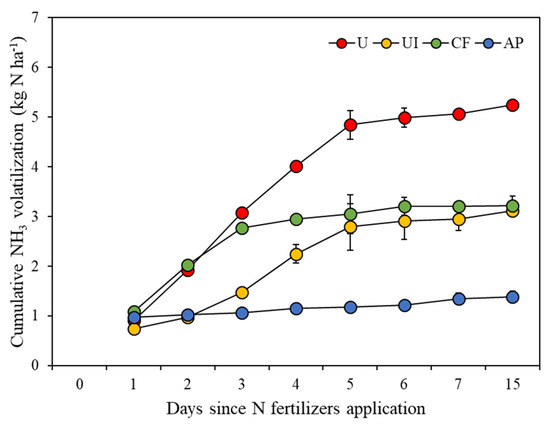 Cumulative NH3 volatilization varied significantly with different types of N fertilizers at the 180 kg N ha−1 level over time (Figure 2). Daily NH3-N volatilization of U and CF treatments peaked on day 2 after fertilizer application, whereas UI and AP treatments were delayed to day 4 and day 7, respectively. NH3-N volatilization from the AP treatment varied little and remained low throughout the incubation period, whereas cumulative NH3 volatilization increased rapidly in the U treatment. The cumulative NH3 losses from the UI and CF treatments were at the medium level compared with the U and AP treatments, and NH3-N volatilization from the CF treatment increased faster than from the UI treatment at the initial stage (day 1 to day 3). The cumulative NH3 volatilization from the U, UI, CF and AP treatments was 5.25 ± 0.00, 3.11 ± 0.00, 3.22 ± 0.19 and 1.38 ± 0.12 kg N ha−1 at the end of the 15-day incubation period, respectively. There were significant differences in cumulative NH3 volatilization in soils with different N fertilizers applied in all the treatments (p < 0.05).
