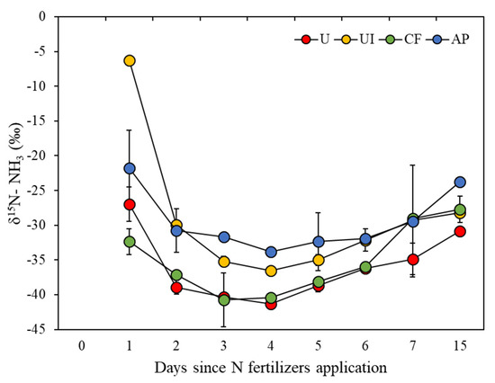 The δ15N values of NH3 volatilized from soils with different N fertilizers applied changed with time during the whole incubation period. They decreased from day 1 to day 4 and then increased after day 4 (Figure 3). Across the incubation period, the δ15N values of U, UI, CF and AP treatment ranged from −41.33 to −26.99‰, −36.57 to −6.30‰, −40.73 to −27.69‰ and −33.78 to −21.77‰, with an average of −36.02 ± 4.95, −29.08 ± 9.70, −35.18 ± 4.98 and −29.42 ± 4.33‰, respectively. The δ15N values of NH3 volatilized from the U treatment were significantly lower than those from the UI and AP treatments during the 15-day incubation (p < 0.05). However, there were no significant differences between other treatments.