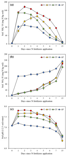 Soil pH had very similar variation trends to soil NH4+-N concentrations (Figure 4c). Soil pH peaked at 7.20 ± 0.02 in the AP treatment on day 1 after N fertilizer application and reached the greatest values at 7.83 ± 0.02 and 7.53 ± 0.05 on day 2 in the U and CF treatments, respectively, whereas the UI treatment peaked on day 4 (7.69 ± 0.04). At the end of the experiment, soil pH in the U, UI, CF and AP treatments was 6.56 ± 0.08, 6.37 ± 0.04, 6.62 ± 0.02 and 6.65 ± 0.01, respectively. Soil pH in the U treatment was significantly different from that in the AP treatment (p < 0.05), with no significant differences between the other treatments.