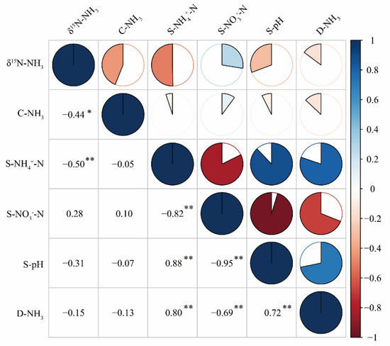 Throughout all treatments, δ15N-NH3 was negatively correlated with soil NH4+-N and cumulative NH3 volatilization (Figure 5). The soil NH4+-N concentration was positively correlated with the daily NH3 volatilization, and the soil pH was positively correlated with the soil NH4+-N concentration. Moreover, the daily NH3 volatilization negatively correlated with soil NO3−-N concentrations.