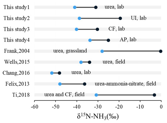 According to previous studies, most of the observed δ15N-NH3 values were based on field monitoring of the urea application, and research on other types of N fertilizers is lacking (Figure 6). A notable finding in this study was that δ15N-NH3 values in the U treatment were significantly lower than those in the UI and AP treatments, which were distinctly different from previous research on δ15N-NH3 volatilized from soils with urea applied, as shown in Figure 6. Moreover, the sampling time caused changes in δ15N-NH3 values during the whole incubation process in this study. Similarly, prior researchers have reported a large variation in δ15N-NH3 values during the volatilization process [23,25,27].