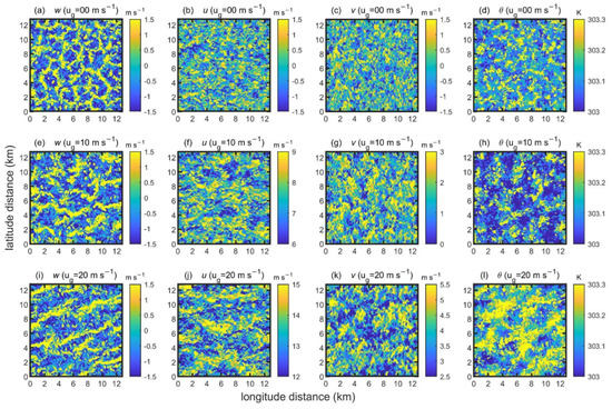 As shown in the first column of the plots in Figure 1, w’s horizontal field transforms from cellular structures to roll-type organizations as Ug increases from 0 to 20 ms−1, which is consistent with Young et al.’s findings [4]. The horizontal structures of w consist of rectangular cells with narrow updrafts along the edges and broad downdrafts in the center when Ug = 0 ms−1 (Figure 1a); as Ug = 20 ms−1 (Figure 1e), they are characterized by long and linear updrafts bent slightly from the x-direction; as Ug = 10 ms−1 (Figure 1i), they are in an intermediate transition state. The transition of w’s horizontal structures corresponds to Salesky et al.’s [26] and Zhou et al.’s [27] findings.