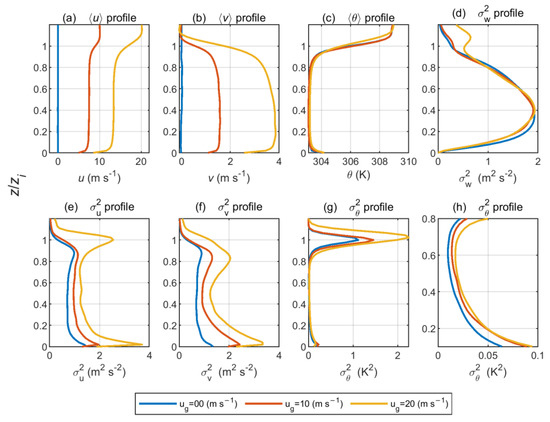 The w variance (, Figure 2d), u variance (, Figure 2e), v variance (, Figure 2f), and θ variance (, Figure 2g) are examined throughout the height of the CBL. For a fixed value of z/zi and a constant Q0, differs insignificantly, whereas and increase monotonically with an increasing Ug, suggesting that the TKE vertical component, , remains nearly identical, and the TKE horizontal components, and , become larger with an increasing Ug, which is consistent with the results of Salesky et al. [26].