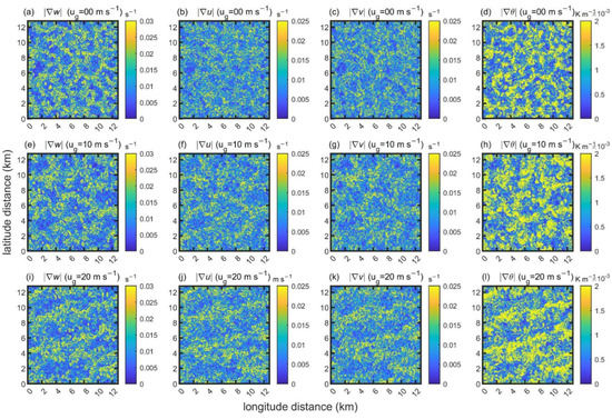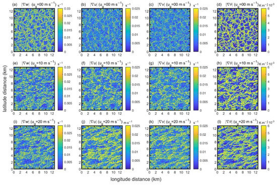 In Figure 3, the distributions of u, v, w, and θ’s horizontal gradient magnitudes are similar to the structures of u, v, w, and θ’s horizontal fields at z/zi = 0.5 (Figure 1). Moreover, u, v, and θ’s horizontal gradient magnitude distributions (Figure 3) demonstrate that the horizontal gradient magnitudes increase with an increasing wind shear at z/zi = 0.5, which means that the spatial variation of u, v, and θ strengthens as the wind shear increases in the middle of the CBL. On the other hand, the variational tendency of the horizontal gradient magnitude of w with wind shear is not obvious at first glance and requires further investigation.