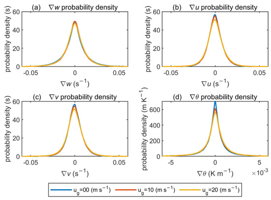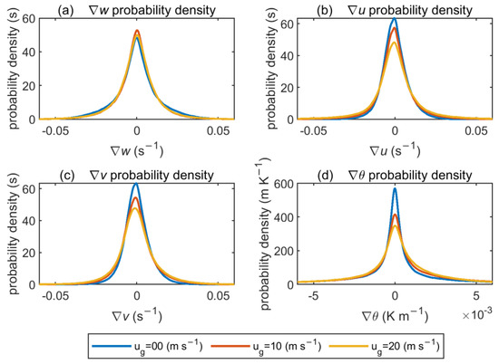 The distributions of the horizontal gradients of u, v, w, and θ near the surface (z/zi = 0.1) are also investigated. As shown in Figure 5 and Figure 6, with an increasing wind shear, the evolutions of w, u, v, and θ’s horizontal gradient magnitudes at z/zi = 0.1 are similar to those at z/zi = 0.5, i.e., with increasing wind shear, at z/zi = 0.1, the horizontal gradient magnitudes of u, v, and θ increase, whereas the horizontal gradient magnitudes of w still present an insignificant variation trend (Figure 5). This is due to the results that, with increasing wind shear, w’s variances differ a little and almost remain identical throughout the CBL’s depth (Figure 2d). Hence, at z/zi = 0.1, the PDFs of horizontal gradient magnitudes of w also present an insignificant variation trend with wind shear, such as reaching a maximum with Ug = 10 ms−1 and a minimum with Ug = 0 ms−1 near the point of gradient value = 0 in the x-coordinate (Figure 6a).