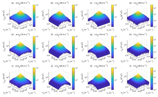 Instantaneous snapshots of w’s PSD (, the first column), u’s PSD (, the second column), v’s PSD (, the third column), and potential temperature θ PSD (, the last column) from LES simulations at z/zi= 0.5 and 3 h of physical time across the range of Ug. First row Ug = 0 ms−1; second row Ug = 10 ms−1; third row Ug = 20 ms−1. The x-coordinate represents the wavenumber, y-coordinate the k2 wavenumber, and the z-coordinate the PSD. Note that the PSDs of , , and are scaled by the logarithm for clarity and contrast (i.e., , , , ).