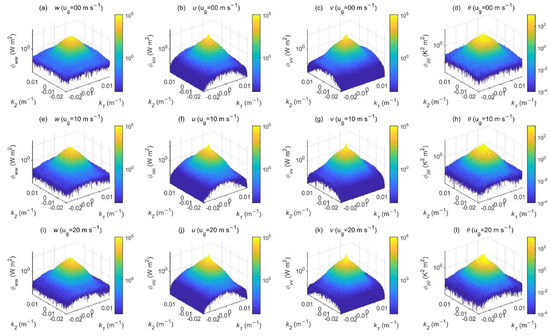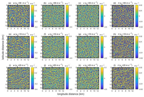 The D0 is set as 9.375 × 10−4 m−1, which means the harmonics with wavenumbers less than 9.375 × 10−4 (i.e., λ > 1067 m) are filtered out. As wind shear increases, the snapshots of the w, u, v, and θ horizontal fields at z/zi = 0.5, which are filtered out of harmonics with λ > 1067 m, present no obvious large-scale organized structures, preferring the distribution of random white noise, as shown in Figure 11. In contrast, as displayed in Figure 1, the organized large-scale structures of the u, v, w, and θ horizontal fields are more pronounced, indicating that large-scale atmospheric motions (i.e., a low-wavenumber PSD) play an essential role in the organization of the large-scale structures of the CBL. Therefore, it is reasonable to expect that as the mean wind shear increases, the large-scale atmospheric motions will also increase. Therefore, the organized large-scale structures in the CBL become apparent with increasing wind shear.