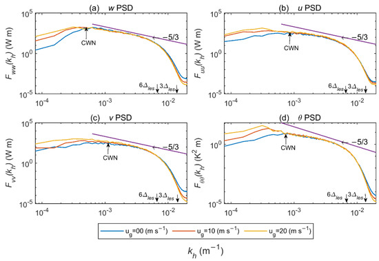 For w, at z/zi = 0.1, the PSD curves tend to be flatter in the entire wavenumber space range than those at z/zi = 0.5 (Figure 9a vs. Figure 10a), due to the w fields at z/zi = 0.1 being blocked by the presence of walls [32]. It should be noted that in the high-wavenumber range, the PSD of w slightly decreases with increasing wind shear. Thus, at z/zi = 0.1, because (1) the low-wavenumber PSD values are much smaller than those of u and v, and (2) the PSD decreases slightly with increasing wind shear in the high-wavenumber range, resulting in the variance of w being the largest as Ug = 0 ms−1 (Figure 2d).