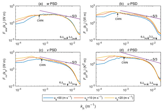 For u and v, as Ug = 0 ms−1, in the inertial subrange, the slopes of u and v PSD are more consistent with the law, while as Ug = 10 ms−1 and Ug = 20 ms−1, the slopes of u and v PSD deviate from the law (Figure 10b–c). This may be because the turbulent eddies in the inertial subrange lose their isotropy due to the presence of walls. The PSDs of u and v increase with increasing wind shear in the entire wavenumber range, resulting in the variance of u and v increasing significantly with increasing wind shear. However, the PSD curves of u and v still collapse into each other at the CWN point.