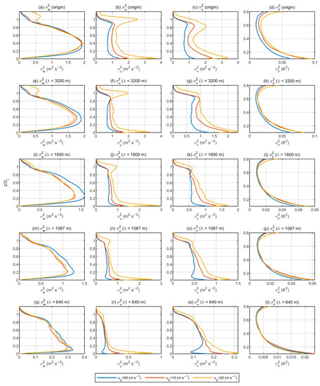 To investigate the effects of low wavenumber harmonics on the variances of the u, v, w, and θ horizontal fields, the D0 is set as 3.125 × 10−4 m−1 (λ = 3200 m), 6.25 × 10−4 m−1 (λ = 1600 m), 9.375 × 10−4 m−1 (λ = 1067 m), and 1.25 × 10−4 m−1 (λ = 800 m) to remove the harmonics with λ greater than 3200, 1600, 1067, and 800 m, respectively. The vertical variance profiles of the filtered u, v, w, and θ horizontal fields are plotted in Figure 12.