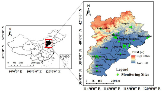 The BTH region is located in the northern part of China (113°04′–119°53′ E, 36°01′–42°37′ N), including Beijing, Tianjin, along with Hebei Province (Figure 1). The topography of the northwestern BTH region is primarily mountains and plateaus, while the southeastern part is mainly plain. The altitude ranges from −50 m to 2835 m. The climate is a typical warm temperate continental monsoon, with an annual mean temperature of about 15 ℃ and annual mean precipitation of about 560 mm. The population density is high and O3 pollution is relatively serious. In addition, there are enough O3 concentration monitoring stations to establish the BME model, and the stations are distributed in each city in the BTH region. Therefore, the BTH region was chosen as the study area.