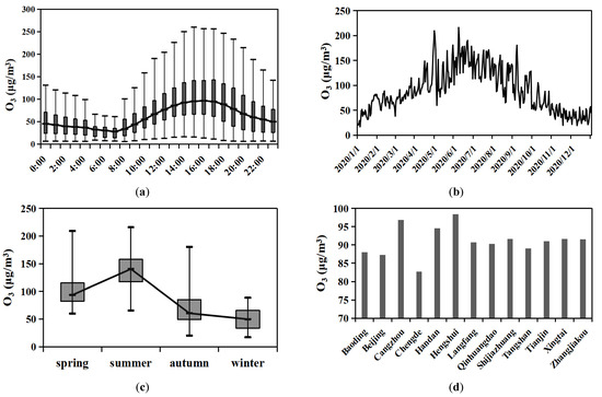 Variation characteristics of observed O3 concentrations in 2020. (a) hourly O3 concentration, (b) daily maximum 8-h average O3 concentration, (c) seasonal maximum 8-h average O3 concentration, and (d) annual maximum 8-h average O3 concentration in different cities.