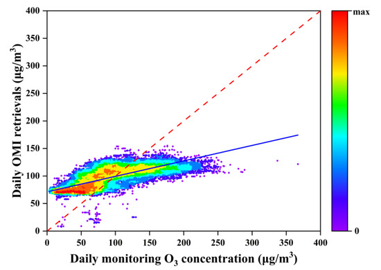 Correlation of daily O3 concentrations and OMI retrievals. The dashed line is the 1:1 line, while the solid line is the linear regression.