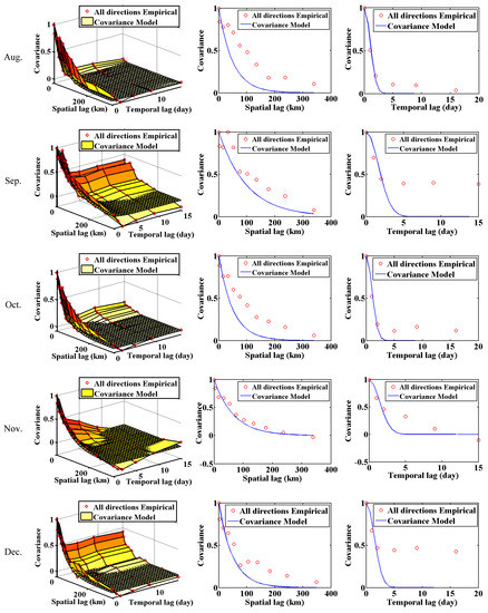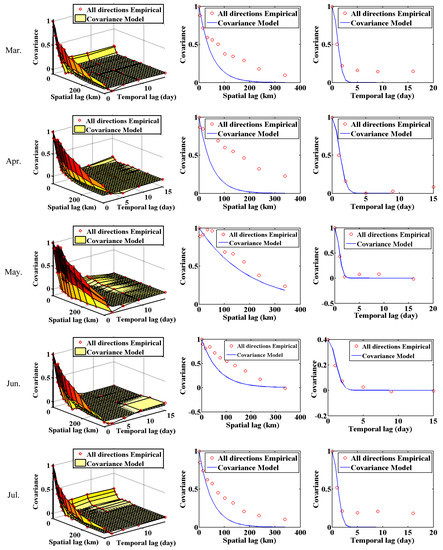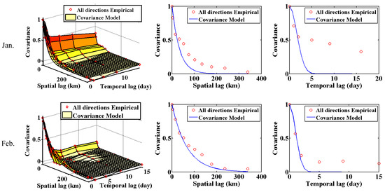 The empirical covariances of O3 exposure reflected the distribution and variation of O3 concentrations in different spatio-temporal coordinates. In this study, the covariance of each month was different, and some months appeared to have poor fitting performance, mainly due to the spatio-temporal dependence of O3 concentrations. Lower covariance values represented greater variability in O3 concentrations and weaker spatio-temporal dependence of O3 concentrations, which increased the difficulty of capturing spatio-temporal features and made the O3 concentration estimations less accurate.