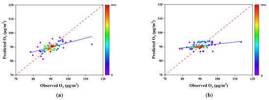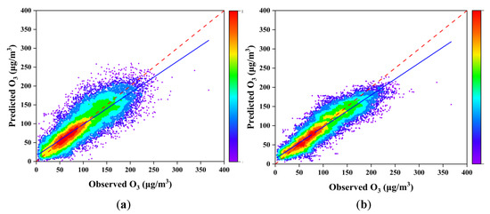 Scatter plot of observed and simulated daily maximum 8-h average O3 concentration in the BTH region based on LOOCV (a) and leave-city-out validation (b). The dashed line is the 1:1 line, while the solid line is the linear regression.