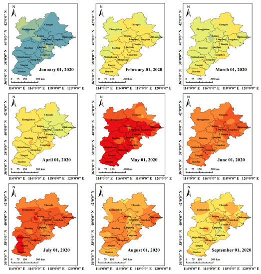Taking the first day of each month as an example, the spatial distributions of the daily maximum 8-h average O3 concentration in the BTH region in 2020 were shown in Figure 6. The lowest simulated daily maximum 8-h average O3 concentration value was on 1 January (21.2 μg/m3) and the highest value was obtained on 7 June (206.3 μg/m3). O3 concentration values in Handan, Hengshui, Cangzhou, and Xingtai were at high levels, while the O3 concentration values in Chengde and Shijiazhuang were low.