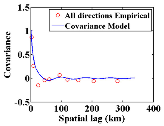 Observed (red circles) and modeled covariance of the O3 residual concentrations on a one-year time scale shown as a function of spatial lag in BME.