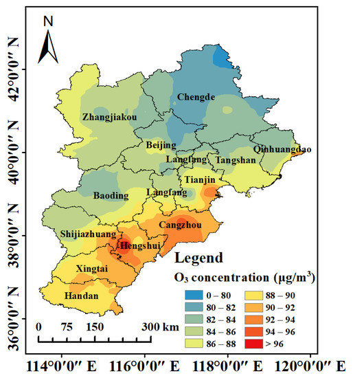 In 2020, the simulated annual maximum 8-h average O3 concentrations for each grid cell varied from 79.5 μg/m3 to 97.5 μg/m3 in the BTH region. Figure 9 shows O3 one-year exposure level based on the BME model. High O3 concentrations were presented in the southeastern BTH region while low O3 concentrations were mainly concentrated in the northwest. The high-value center of O3 concentration was around the southeast of Hebei Province, especially Cangzhou and Hengshui. The O3 concentration was also higher in the northeast of Handan, Xingtai, and the east of Tianjin. The lowest O3 concentration was in Chengde. Other cities including Qinhuangdao, Baoding, and Zhangjiakou also had low O3 concentrations.