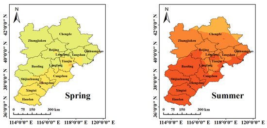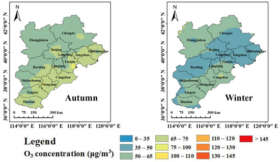 Figure 10 presents the seasonal distributions of O3 concentration in 2020. The highest average O3 concentration value was in summer (134.5 μg/m3), followed by spring (100.9 μg/m3) and autumn (65.3 μg/m3), and the lowest average O3 concentration value was in winter (51.1 μg/m3). Generally, O3 concentrations in the southeastern part of the BTH region were significantly higher than those in the northwestern part of the BTH region. Tianjin, Cangzhou, Hengshui, Xingtai, and Handan had always been the relatively high concentration areas in four seasons. Compared with other cities, the O3 concentration in Chengde was the lowest in all the seasons. For Baoding and Shijiazhuang, the O3 concentration in summer was high and then decreased rapidly in winter. There were significant seasonal and regional differences in O3 concentration in the BTH region. The simulation results of O3 concentration in this study were similar to the published studies [56,57].