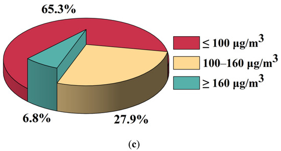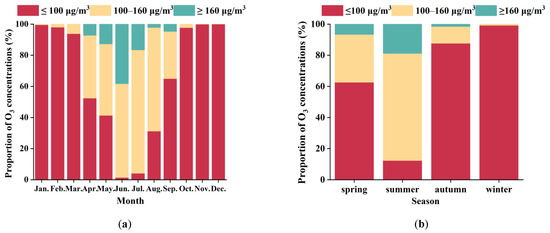 Percentages of grids with daily maximum 8-h average O3 concentrations below 100 μg/m3, between 100 and 160 μg/m3, and above 160 μg/m3 based on BME in the BTH region. (a) in each month, (b) in each season, and (c) in 2020.