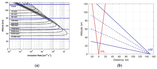 (a) The profiles of the ionization rate from [25]. (b) Schematic view of photometers FOVs. VTL—Verkhnetulomsky observatory (red lines), LOZ—Lovozero observatory (blue lines). Dashed blue lines indicate individual FOVs of three photodetector modules of the LOZ photometer.