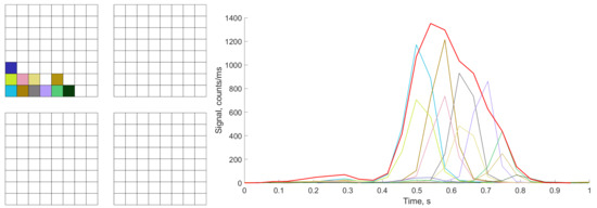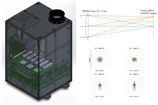 - photodetector—a matrix of 4 multi-anode photomultiplier tubes (MAPMTs) ( pixels, covered with BG3 filters transparent in the range of 300–400 nm);