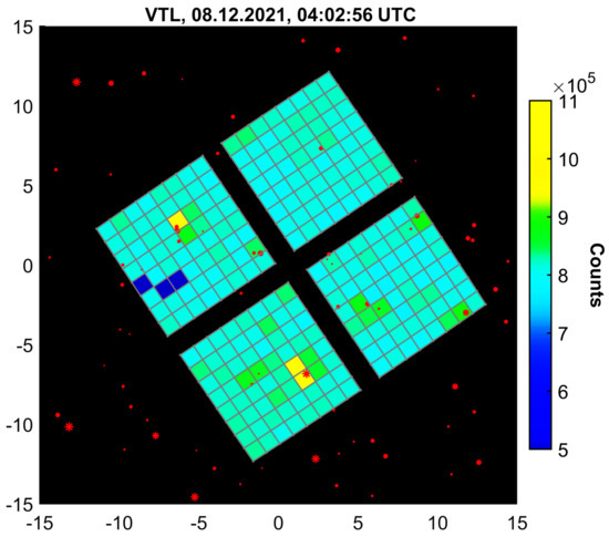 In Figure 4, the pixel map measured on 8 December 2021 at 04:02:56 UTC is presented. It is placed on the top of the night sky image, which is seen at this time above VTL. Bright pixels in the FOV (yellow and green) correspond to stars. The two brightest are Dubhe (Alpha Ursae Majoris) with magnitude M = 1.79 and Kappa Draconis with M = 3.87. Less-bright stars in the left bottom corner of the pixel map also belong to the Ursa Major and have magnitudes of more than 4. A correspondence between telescope measurements and the position of stars is well seen. The size of the star image shows the rather good quality of the optical system. The central gaps in the image correspond to the dead zone between MAPMTs in the photodetector, which is formed due to the mechanical coupling of MAPMT housing.