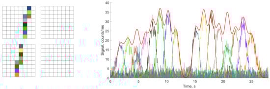 The slowest object for observation (apart from the stars), producing a straight track on the photodetector, is the orbital motion of satellites. An example of such an event is shown in Figure 5, which shows the location of triggered channels (i.e., channels in which the signal significantly exceeds the background) on the left and their signals on the right. (Colors of pixels on the channel map and signal curves match each other.) Here the signals are expressed in counts per ms.