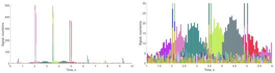 Signals from a plane on the Moscow–Murmansk route on 5 December 2021 (as a stacked histogram). On the right, zoomed version of the same event.
