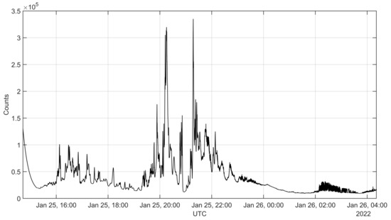 Integral light curve (the sum signal from all pixels vs. UTC) measured by photometer in VTL during 25–26 January 2022 night.