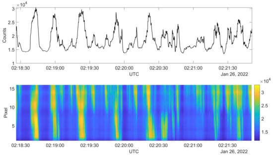 The detector works in a continuous monitoring measurement mode with a 41 ms temporal resolution, and it allows us to obtain detailed information for the whole night. In Figure 8, the example of such measurements (integral light curve of the photometer) is shown. Different temporal structures, which correspond to various types of aurora, can be seen. Intensive spikes in emissions correspond to bright aurora arcs that appear and move in the photometer FOV. After 02:00, a fast variation in emissions is seen. This is an example of PsA. The more detailed waveform and a North–South keogram (diagonal pixels of the photometer matrix that lay close to the North–South direction) are shown in Figure 9. The intensity of the pulsations, as well as their period, change with time. The so-called internal modulation with higher frequency can be recognized during the “ON’’ phase of pulsations. This type of aurora usually occurs after midnight and are observed for 1–2 h.