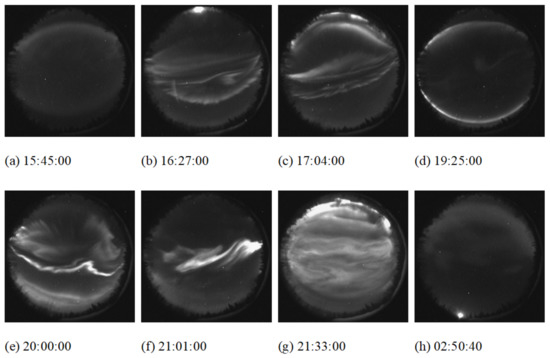 At this time, a strip of pulsating aurora is observed in the VTL in the north. The shift of the strip to the south was accompanied by the development of a small, up to 100 nT, negative variation (“bay”) in the H-component of the magnetic field at the Loparskaya and Lovozero observatories, as well as the appearance of noise at frequencies below 0.7 Hz, according to the data of induction magnetometers in LOZ and VTL. The glow registered at this time can be classified as a streaming pulsating aurora, in which the emerging spots quickly move from the place of appearance and disappear (Figure 10h). The spawn locations and displacement direction look chaotic. At the same time, the photometer shows intense pulsations with a higher frequency (see Figure 8). According to preliminary estimates, there are no constant dominant periods in the intensity pulsations in the range from tenths to tens of Hz, but higher fluctuations appear in the whole spectral band at frequencies above 1 Hz.