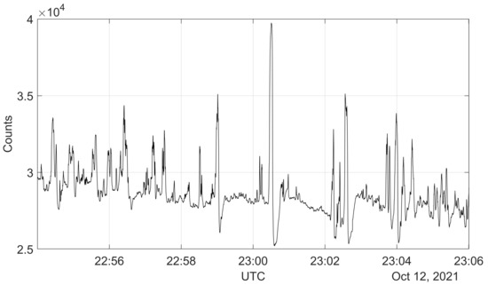 Another example of an interesting event measured on 12 October 2021 is shown in Figure 11. The significant drop in the brightness below the background level just after a high intensity can be seen for a number of peaks. It is a sequence of so-called “over-darkening” aurorae pulses. Such kinds of events have been observed previously ([38,39]), but the generation mechanism of such an over-darkening PsA is still unclarified.