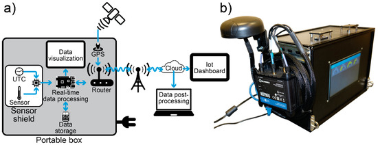 Overview of the sensor box. (a) General architecture of the sensor box where all sensors are attached to a sensor shield and that communicates with the Raspberry Pi; (b) Photo of the sensor box with the router and the screen incorporated in the side of the sensor box.