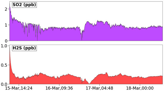 The sensor box also contains the Alphasense SO2 and H2S sensor so that their trends could be registered during monitoring campaigns (see Figure 3). Although SO2 is an important pollutant for seagoing vessels due to the sulphur content in heavy fuel [31,92], that sensor did not show meaningful trends during the organized monitoring campaigns. This must be due to the use of sulphur-poor diesel by the old ship and by the inland ships where measuring campaigns have been organized. The combined NO2-SO2 Radiello radial-type diffusive sampler was able to detect NO2 in several locations on the old ship, but SO2 remained below its detection limit of about 1 ppb for all locations. During one of the measuring campaigns, a reference monitoring system registered a background concentration of 1 ppb with peaks up to 7 ppb in a sleeping cabin. For the dredging sector, H2S is an important pollutant because it is produced in rotting processes in soils that are removed during dredging operations. Due to the problems described below, the trends observed cannot be considered as meaningful: