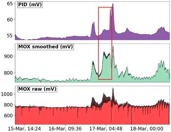 Measured TVOC-signal in mV over time and measured in the engine room during the same campaign as in Figure 2 and Figure 3. The trends are measured with a PID and MOX-sensor. The signal of the MOX-sensor is smoothed by a seven-point central moving median followed by a seven-point central moving average. The scale for MOX raw and MOX smoothed is different because the Y-axis of MOX raw is affected by the amplitude of the high frequency fluctuation. The red box is a detail where the peak ratios are different for PID and MOX sensor.
