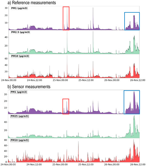 Measured concentration of particulate matter in the wheelhouse of the old ship over time as determined with a high-end and low-cost optical particle counter monitoring. The measuring campaign covered the period 24–26 November 2020; (a) Reference measurements performed with the Grimm; (b) Measurements performed in the same room with the sensor box containing the Alphasense OPC-N3 sensor. The peak ratio in the red rectangle as determined by the 2 instruments are different. For the blue rectangle, the peak height of the largest peak as measured by the sensor is higher than for the reference measurement.