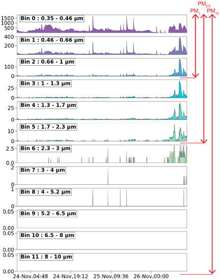 Number of particles in the first 12 size bins as detected by the OPC-N3 sensor over time during the same monitoring campaign as the measurements in Figure 5. The discrete size bins give an insight into the particle size distribution.