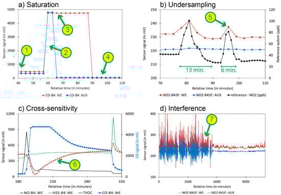 Undersampling: Figure 7b shows the occurrence of two peaks as measured by a reference system with a sampling time of 1 min and an NO2 sensor that is measuring every 3 min. For the sensor measurements, it is clear that some peaks appear as a spike (i.e., arrow 5). In this case, the spike contains meaningful information and should not be confused with an unwanted outlier;