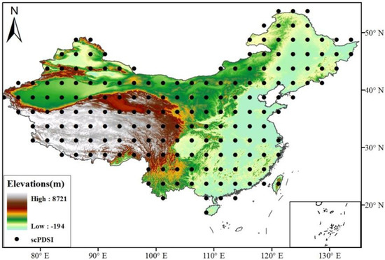 The hydroclimatic index used herein is Dai’s self-calibrating Palmer drought severity index (scPDSI), with potential evapotranspiration estimated by using the more sophisticated Penman–Monteith equation based on historical data [31]. The scPDSI is calculated from a water-balance model forced by observed monthly precipitation and temperature, and it is calibrated by local climatic conditions instead of the fixed coefficients used by Palmer [32]. Thus, the scPDSI is more spatially comparable than is the original PDSI developed by [33]. We use an updated version of the scPDSI, with global coverage based on a 2.5° × 2.5° gridding system, spanning the years from 1850 to 2014 (http://www.cgd.ucar.edu/cas/catalog/climind/pdsi.html, accessed on 13 March 2016). Since most of the meteorological stations in China were not established until the 1950s, we only use the scPDSI for the period from 1951 to 2014 (a total of 768 months). A total of 193 scPDSI grid points across China are used in this study (Figure 1).