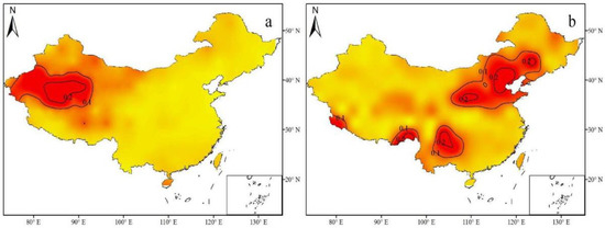 In addition, special attention has been paid to extreme hydroclimatic change (|scPDSI| > 0.4) via an examination of their spatial distributions (Figure 3). As shown, the problem of the over-reporting of the extreme dry or wet conditions, which has been reported for the original PDSI dataset [2], still exists in the self-calibrated data. The over-reported extreme wet spells are not found in traditionally humid regions (e.g., South China), and instead are mainly found on the North Tibetan Plateau and in South Xinjiang (Figure 3a). Similarly, the extreme dry regimes are mainly represented in North and Southwest China instead of in traditionally semiarid and arid regions (e.g., Northwest China) (Figure 3b). In fact, the scPDSI was developed to describe the cumulative departure from the mean values in moisture supply and demand at the local surface level [31,33]. Therefore, persistent increases or decreases in moisture can give rise to the occurrence of clusters of extreme scPDSI values. This is in good agreement with many previous studies that have revealed that a persistent drying trend has been in place since the 1950s in North and Southwest China [19,40,41,42,43], while a remarkable wetting trend has been found in arid Central Asia [44].