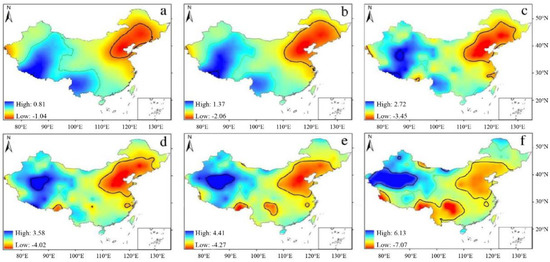 Spatial evolution of the EEMD-based trends of scPDSI across China ending in (a) 1960, (b) 1970, (c) 1980, (d) 1990, (e) 2000, and (f) 2014, respectively. Variations significant at the 0.05 level are highlighted by black lines. The green line symbolizes the change value of zero.