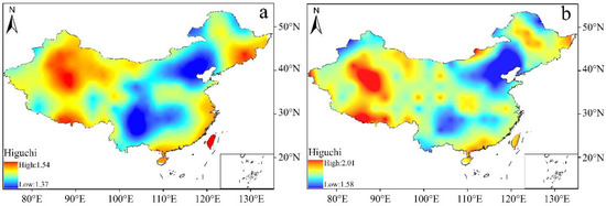 The spatial pattern of the HFD exponents for the scPDSI dataset over the entire domain is presented in Figure 5, which illustrates that the HFD values on a monthly scale range between 1.37 and 1.54 (Figure 5a), and the ones on an annual scale vary between 1.58 and 2.01 (Figure 5b). We found that none of HFD values is an integer, indicating that the hydroclimatic variations across the region are chaotic dynamic systems with fractal characteristics, and they are sensitive to the initial conditions [28,29,30]. A comparison of the HFD values reveals that the complexity of the hydroclimatic dynamics in China decreases along with an increase in the temporal scale. This result accords with many previous studies that demonstrated that the climate data with higher resolution often contain more details and thus are more complex [30].