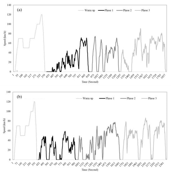 Vehicle driving conditions are operated by the Bangkok driving cycle (BKKDV) developed from the real on-road with the cold and hot start from the three phases at speed ranges of 0–30 km/h (Phase 1), 30–40 km/h (Phase 2), and 40–80 km/h (Phase 3). A cold start is referred to as a start when the engine has been completely cooled off, resting for 18 h or more. A completely warm start is when a warm engine is shut off for five minutes or less before starting again []. In cold start conditions, vehicles emit significantly more pollutants than in hot driving conditions due to unfavorable thermal conditions for emission control []. The three speed ranges represented the average low speed (Urban area), medium speed (Suburban area), and high speed (rural area or motorway), respectively. The total phase, including three-speed ranges, was considered one driving cycle. The regulation of speed limits in Thailand allows LDVs to travel up to 90, 100, and 120 km/h on an urban road, a suburban road, and a motorway, respectively []. The maximum speed, average driving speed, time distance, and time of all phases for the entire driving cycle for LDG and LDD vehicles are presented in Table 2, and Bangkok’s driving cycle is presented in Figure 2.