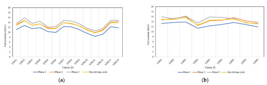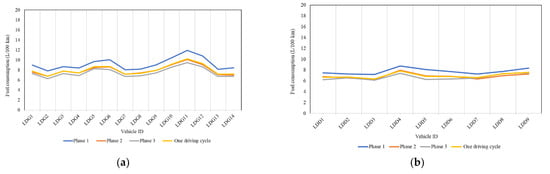 Fuel consumption rate (L/100 km) for (a) LDG vehicle and (b) LDD vehicle.