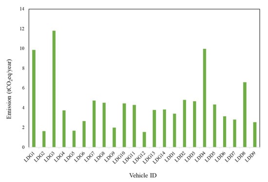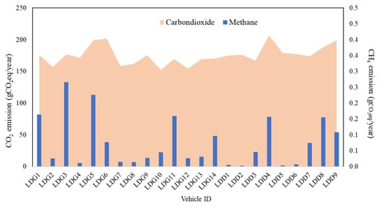 The emission of greenhouse gases (GHGs), including CO2 and CH4, were estimated as CO2 equivalents in tons per year (tCO2eq/year). According to the 100-year Global Warming Potential (GWP) of CH4 from the Fifth Assessment Report (AR5), it is equal to 28, which is relative to CO2 []. Annual average mileage was calculated from the accumulated mileage of each vehicle, and it was considered with total emission factors of GHG (g/km). The CH4 emission in the unit of gCO2eq/year was calculated. The CO2 and CH4 emissions are illustrated in Figure 5.
