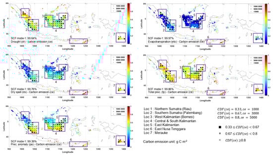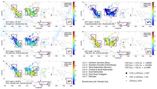 Burned area was the primary indicator to reflect the scale of the wildfire event. Figure 1 shows a joint spatial pattern between the burned area () and each used drought indicator (). The analysis is focused on seven different locations across the Indonesia region, which are Northern Sumatra (Loc 1), Southern Sumatra (Loc 2), West Kalimantan province (Loc 3), Central and South Kalimantan province (Loc 4), East Kalimantan province (Loc 5), East Nusa Tenggara (Loc 6), and Merauke (Loc 7). Since the first mode SCF of all indicators is already more than 99%, the analysis is focused on how well each paired variable describes all wildfire events using only the first mode. Therefore, we can summarize their performance in a robust analysis, such as describing wildfire events in areas with multiple precipitation patterns. Each indicator shows noticeable differences in describing the drought conditions in Indonesia (Figure 1). In order to make an easier comparison between each drought indicator, we removed the units of the drought indicators. Therefore, the value is in the range of [0, 1] and the value represents the severity of the drought season according to each indicator.
