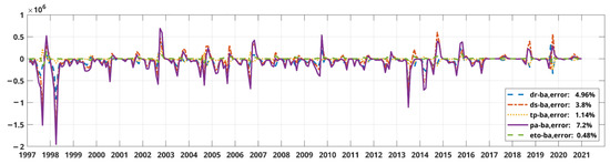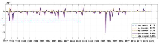 The joint temporal pattern of each drought indicator with ce has a similar behavior in describing carbon emission, where the slightest error obtained is from eto, and the most error is obtained from pa (Figure 4). Compared to Figure 2, the difference occurred on dr and ds. The dr temporal pattern in Figure 4 has less errors than ds, which is opposite to Figure 2. Moreover, the most errors did not occur in 1997 and 1998, but in 2013. All temporal patterns failed to capture the high ce in the 2013 fires event. This behavior indicates that the fire event in 2013 produced a significantly high amount of ce for a similar amount of burned area in other years. A similar behavior of high negative errors also occurred in the ce temporal pattern. However, it is not always followed by a high number of errors. Even more, most of the errors are in the negative value range. This behavior shows that the extinguishing attempt cannot always significantly reduce produced ce from the fire event. These results indicate that prevention is more critical than extinguishing attempts. Even though the ba can be reduced significantly, the produced ce is much harder to handle since it is more related to tp and eto (less value of errors).