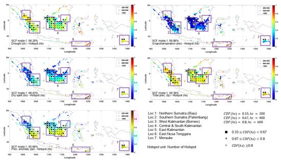 tp is well known as the primary indicator reflecting Indonesia’s dry season. Many indicators are derived from tp that can be used to measure multiple impacts of extreme rain and dry conditions. Pairing tp with wildfire indicators will result in principal components that can capture almost all wildfire events with a minimal error, regardless of the precipitation pattern of the analyzed area. This result is beneficial in early analysis, where we were not sure there were multiple wildfire patterns related to the precipitation patterns in the analyzed variable [5,8]. Since it is the primary indicator, it can be beneficial as an early warning measurement to predict hotspot occurrence in time series analysis [51]. Most of the marked hotspots appear when the severity of the drought condition (according to to tp) is more than 0.5, except on Loc 6 and 7.